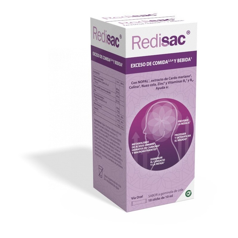 Redisac 10 sticks es útil en situaciones donde se ha consumido alcohol o se ha comido en exceso, ayudando a mitigar el malestar asociado. El cardo mariano actúa como detoxificante hepático y antioxidante, mientras que la colina apoya la función hepática y el metabolismo de lípidos. La nuez cola incrementa la resistencia física y mental, y el zinc protege las células del estrés oxidativo. Las vitaminas b3 y b6 contribuyen al metabolismo energético normal y ayudan a reducir el cansancio.